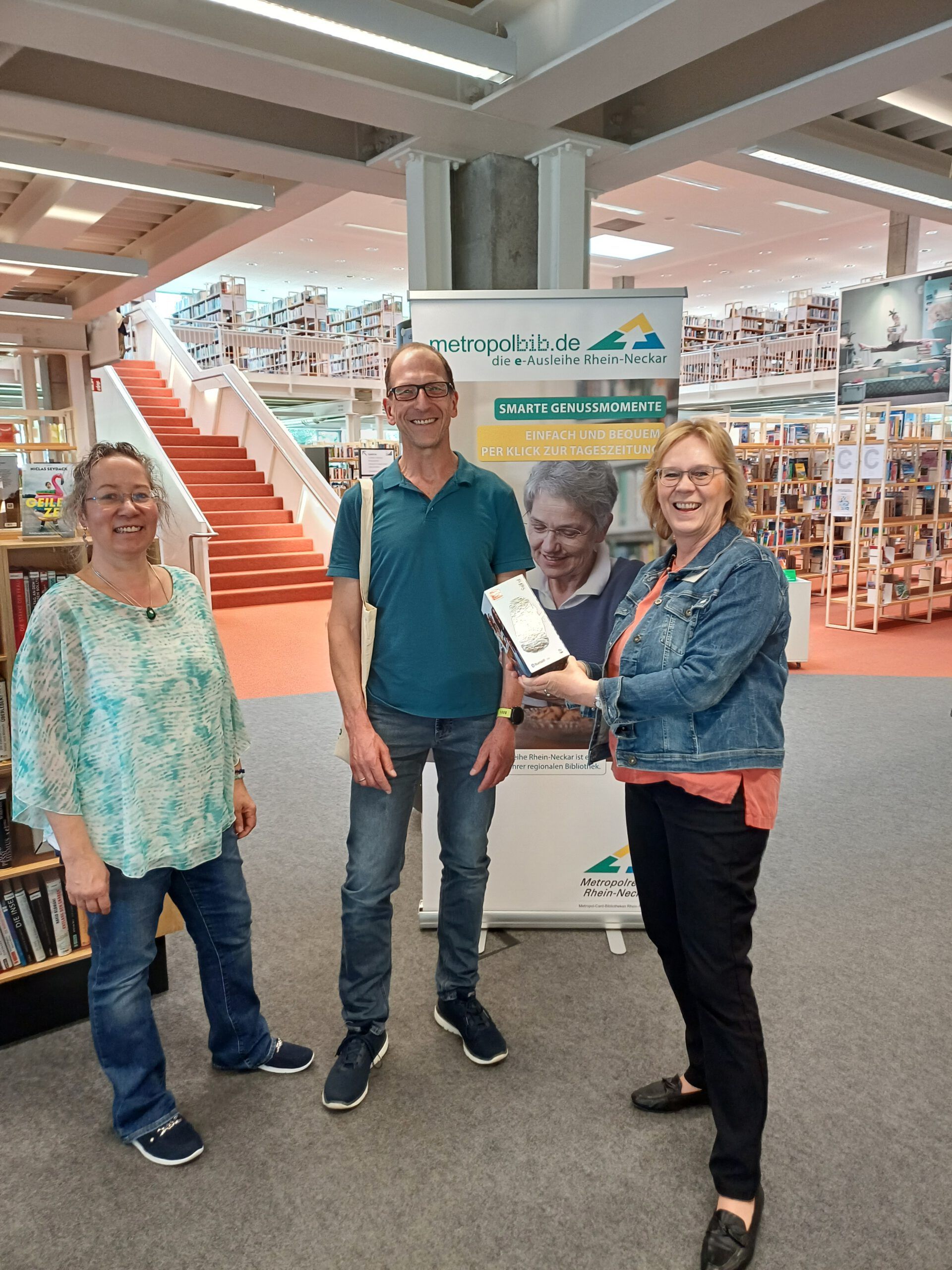 Übergabe des 2. Preises. Von links nach rechts: Geschäftsführerin Regina Herhoff, Gewinner Eric S. aus Heidelberg und Christine Sass, 2. Vorsitzende von Metropol-Card-Bibliotheken Rhein-Neckar e.V. und Direktorin der Stadtbücherei Heidelberg